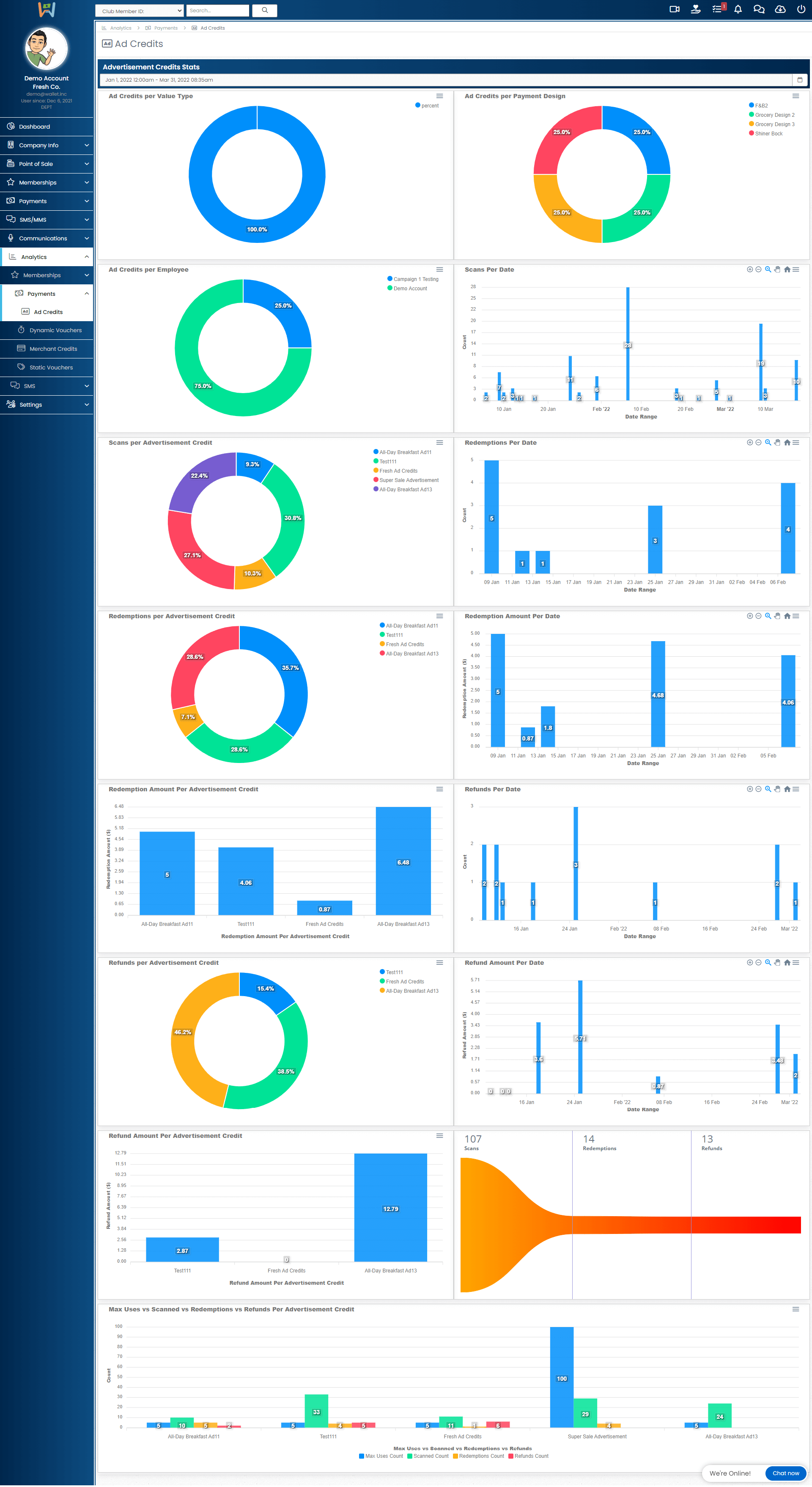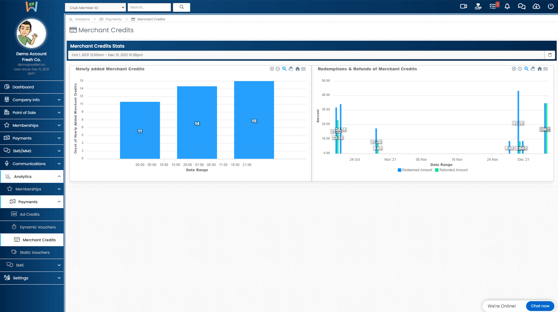 The "Merchant Credits Stats" page Is where your team can track the volume of outstanding merchant credits as well as the redemptions and refunds that occur through time.