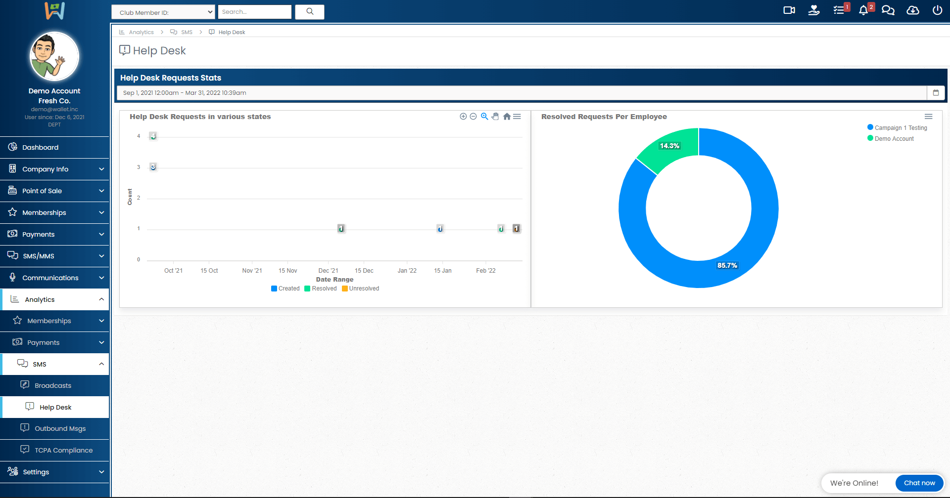 The "Help Desk Requests Stats" page is where you will track your Help Desk/customer service efforts. Track when requests were created, resolved, or unresolved. Monitor the success rate of your customer success efforts and see which of your customer success reps are performing the best.