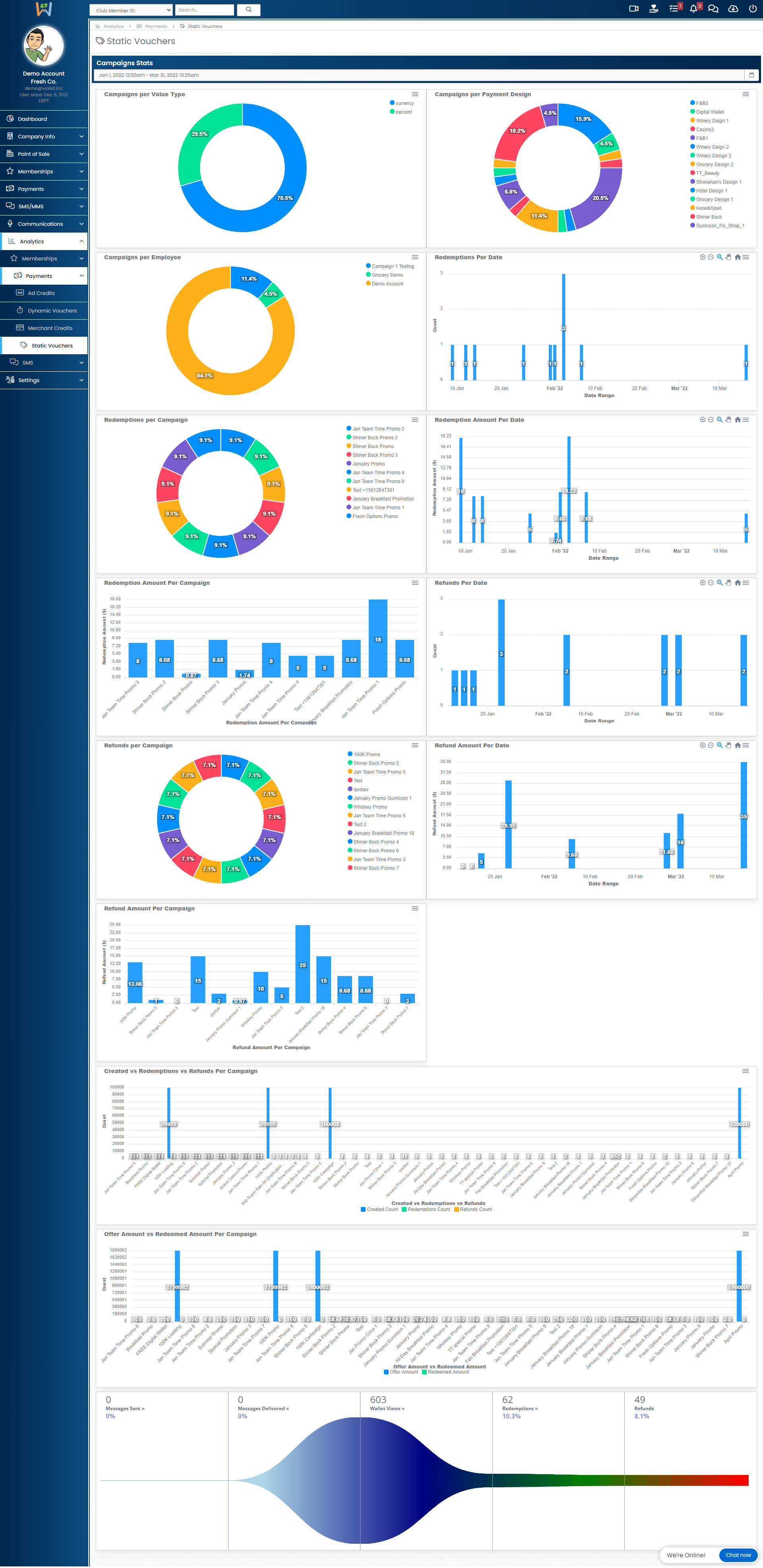 The "Campaigns Stats" page is where you can review and analyze the efficacy of your static vouchers. Using closed loop marketing, this page will help you and your team analyze and review your static voucher efforts to determine what's working and what isn't. Track pivotal stats such as redemptions/refunds per date, redemptions/refunds per campaign and much more!