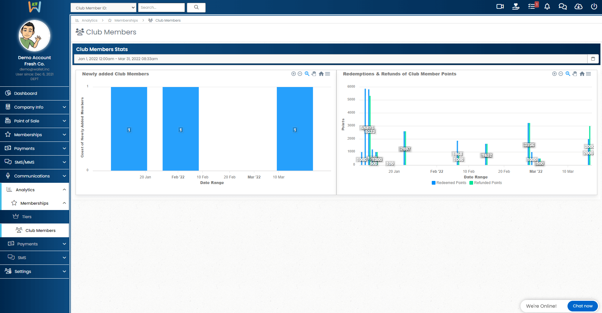 The "Club Members Stats" page allows you to observe how your Club Members area has grown through time. You can also see the number of redemptions and refunds of point by club members through time. This gives you and your team pinpoint accuracy of which campaigns are working best to engage your most loyal customer base.