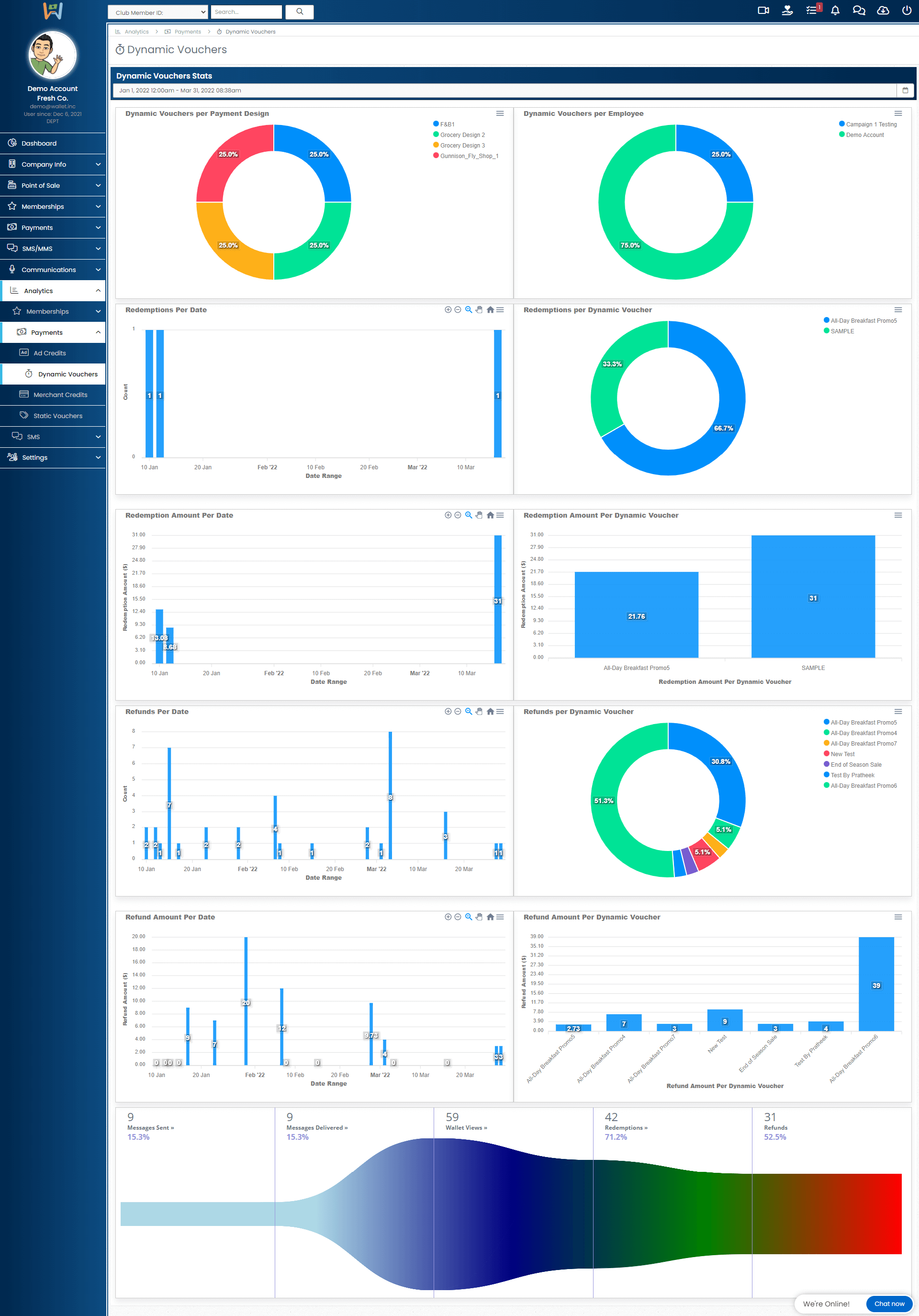 The "Dynamic Vouchers Stats" page is where you can review and analyze the efficacy of your dynamic vouchers. Using closed loop marketing, this page will help you and your team analyze and review your dynamic voucher efforts to determine what's working and what isn't. Track pivotal stats such as redemptions/refunds per date, redemptions/refunds per campaign and much more!