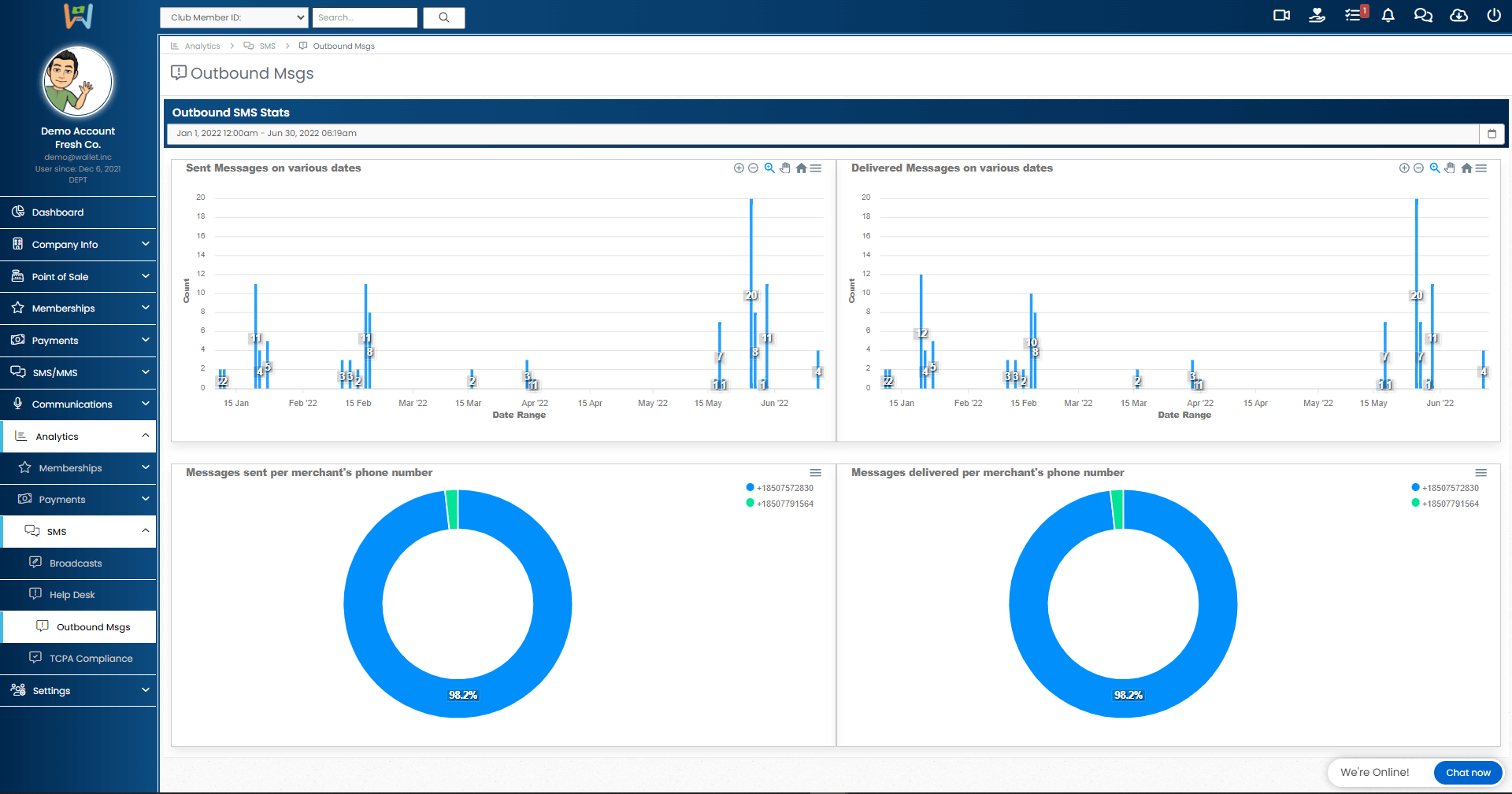 The "Outbound SMS Stats" page is where you will find analytics that reflect the performance of your outbound SMS messaging. This page provides stats like, Messages sent per date and delivered messages per date. You can also see which numbers/10DLCS are being used most to send and deliver your SMS messages.