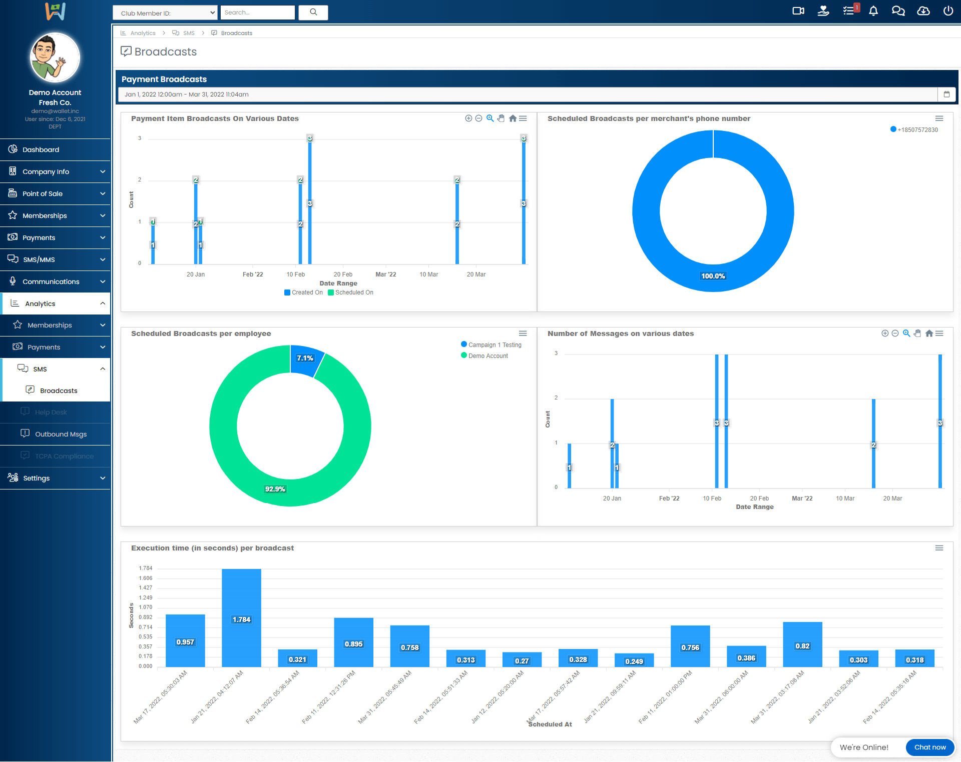 The "Payment Broadcasts Analytics" page is where you can review and analyze the efficacy of your payment broadcasts. Using closed loop marketing, this page will help you and your team analyze and review your payment broadcasts to determine what's working and what isn't. Track pivotal stats such as messages sent per day, payment item broadcasts by date, and scheduled broadcasts per employee.